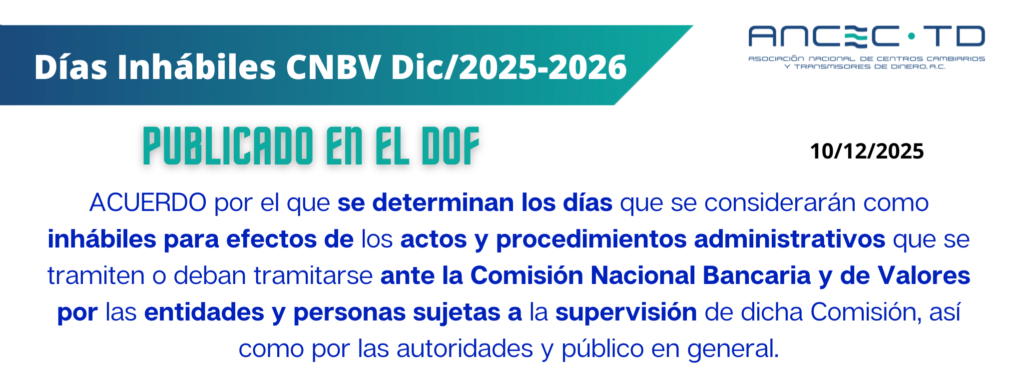 La Comisión Nacional Bancaria y de Valores ha publicado el ACUERDO por el que se determinan los días que se considerarán como inhábiles para efectos de los actos y procedimientos administrativos que se tramiten o deban tramitarse ante la Comisión Nacional Bancaria y de Valores por las entidades y personas sujetas a la supervisión de dicha Comisión, así como por las autoridades y público en general.